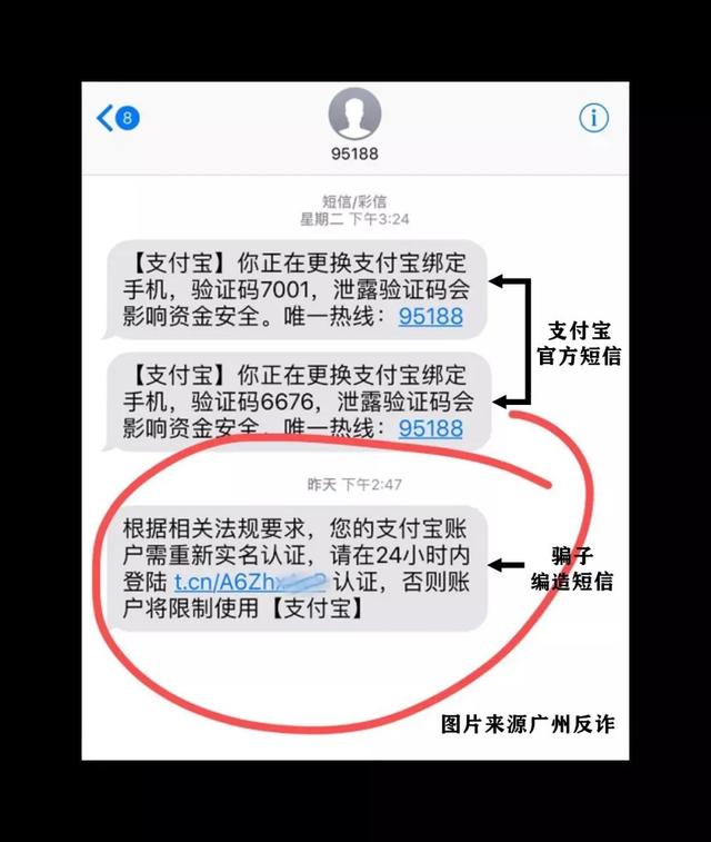 这次受骗者收到的是冒充“95188”发送的短信,通过搜索发现这个号码确实是支付宝官方客服服务电话,但蹊跷的是,短信内容却是要求对支付宝账户重新进行认证,还附了一个网址链接,一旦点击输入个人信息和验证码,钱就会被快速转走……
